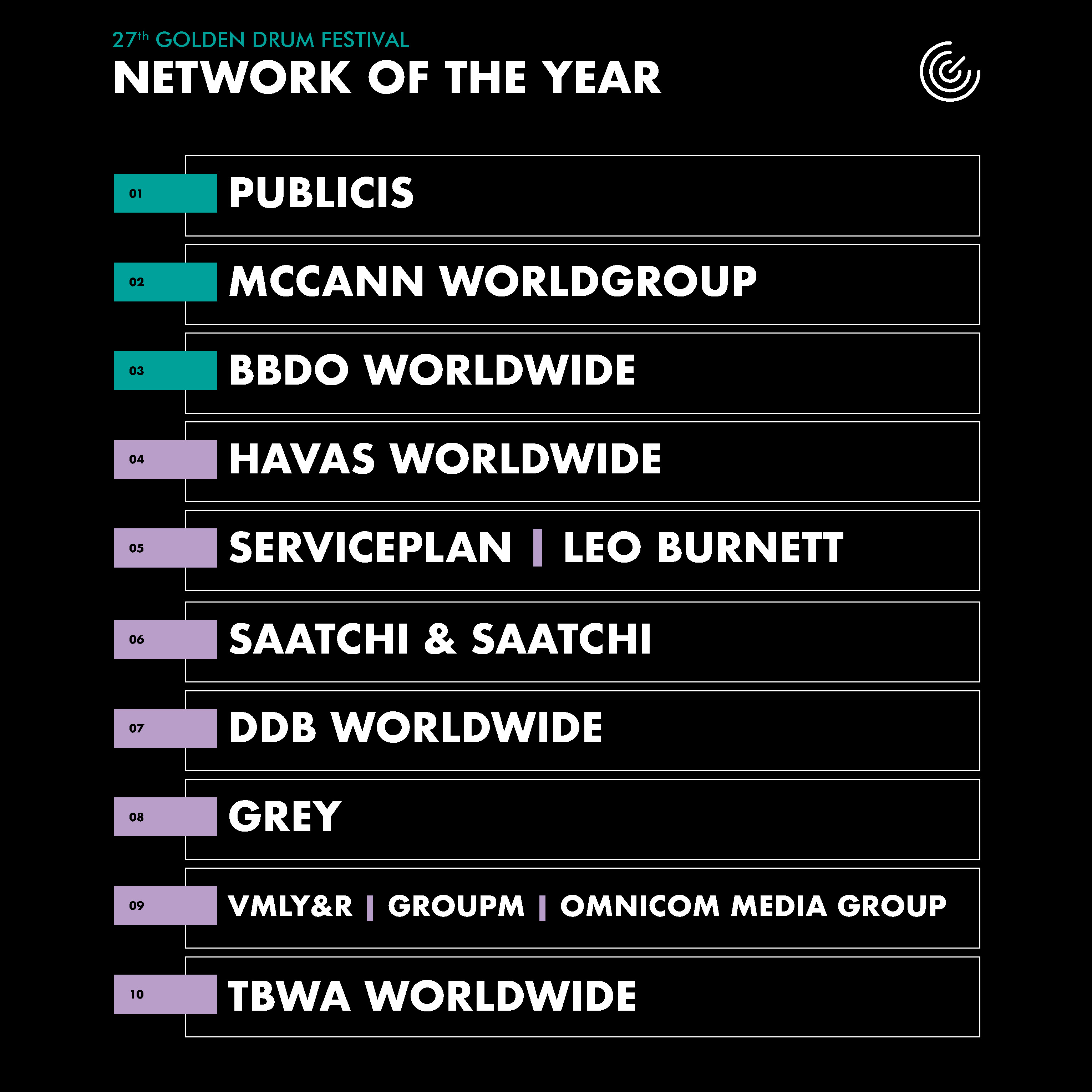 Tytuł Agencji Roku, po raz drugi raz z rzędu trafił w ręce Publicis Italy z Mediolanu, tym samym przyczyniając się do ogólnego sukcesu spółki Publicis, która zebrała najwięcej punktów i została uhonorowana tytułem Sieci Roku.