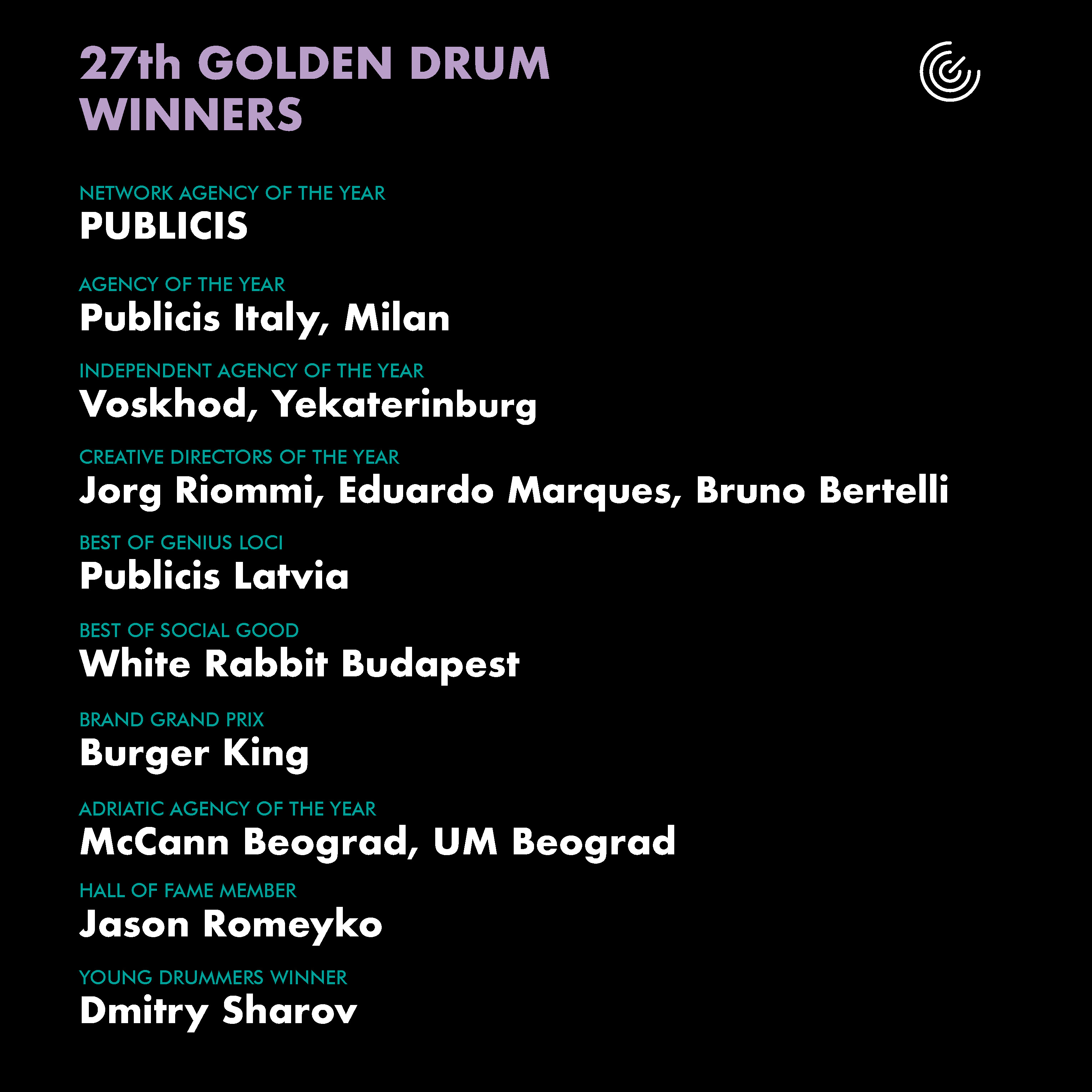 Najlepszą marką, która wyróżniła się podczas 27. edycji festiwalu, zdobywając Brand Grand Prix, był Burger King z 2 nagrodami Grand Prix, 6 Golden Drums, 4 Silver Drums i 2 Bronze Drums we wszystkich kategoriach. Jorg Riommi, Eduardo Marques i Bruno Bertelli, autorzy kampanii Moldy Whopper, zostali uhonorowani tytułem Dyrektorów Kreatywnych Roku.