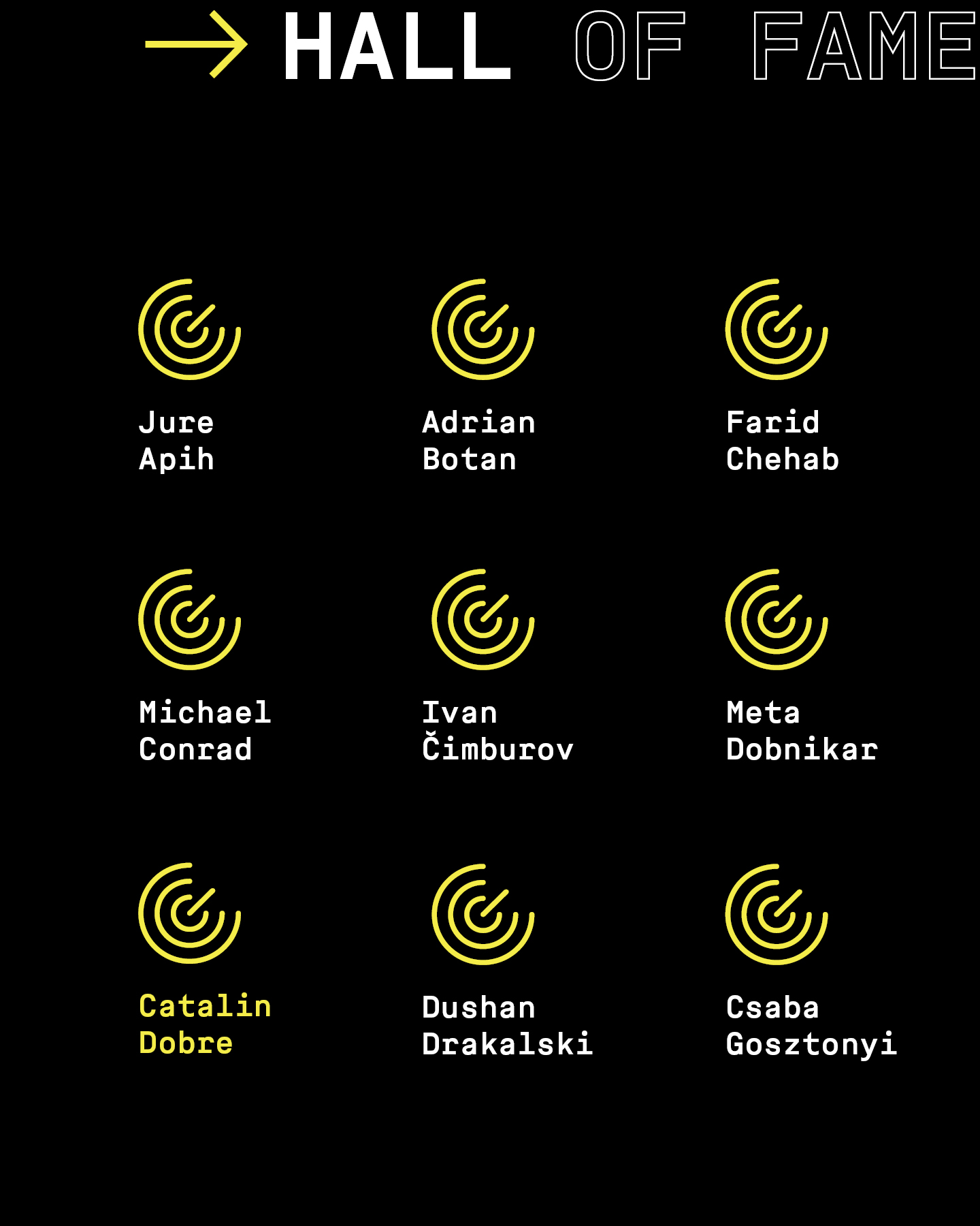 Często z biegiem czasu i czynionymi postępami zapominamy o nazwiskach tych, którzy stworzyli fundamenty, na których dzisiejsi specjaliści budują wielkie osiągnięcia. Wirtualna ściana Galerii Sław Festiwalu Golden Drum powstała w 2010 roku i zawiera nazwiska wspaniałych ekspertów i ekspertek z branży kreatywnej. Liczba nazwisk stale rośnie wzbogacana o imiona i nazwiska osób, o których osiągnięciach zawsze powinniśmy pamiętać. Dodawane są one po starannym rozważaniu, z poczuciem wdzięczności za wniesiony przez nich ich wkład. Każde nowe nazwisko w Galerii Sław musi zostać zatwierdzone i przyjęte przez dotychczasowych członków tej grupy.